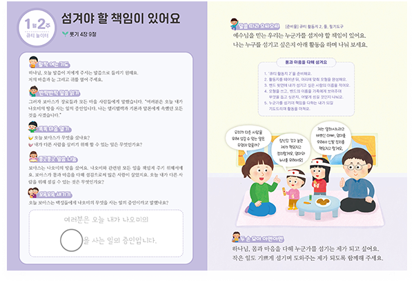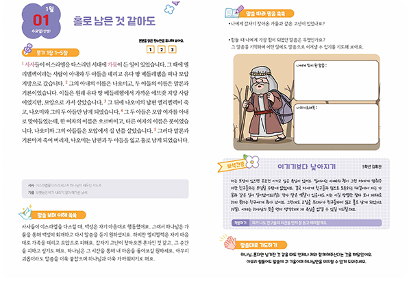 따뜻한 일러스트가 실려 있는 매일의 큐티 본문과 주일마다 실리는 부모님의 간증을 통해 부모님과 함께 영유아들이말씀을 재미있게 묵상하도록 돕습니다.